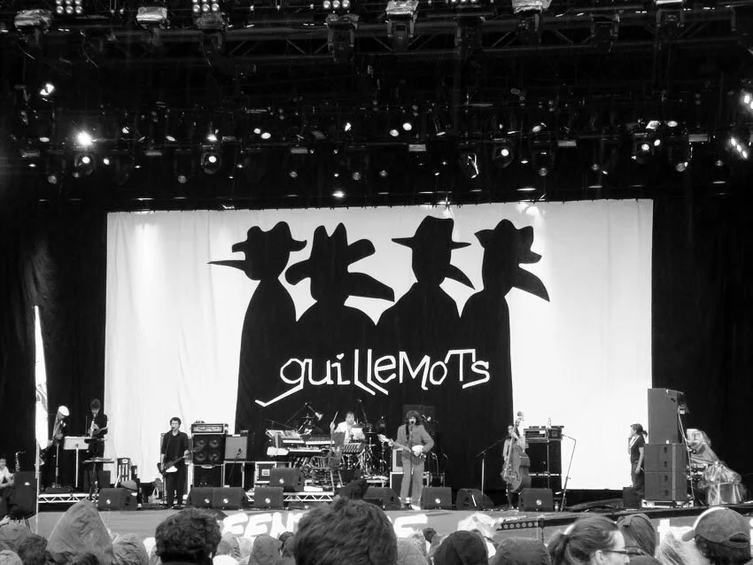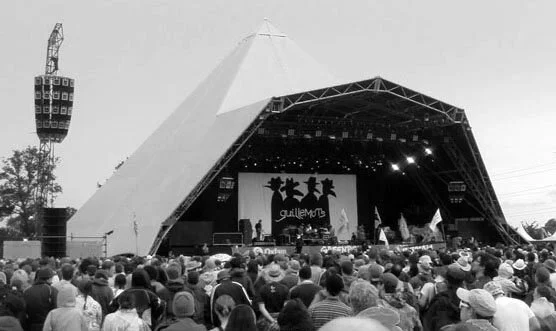 Glastonbury’s pyramid stage. Backdrop illustration ‘Guillemots’ 2007